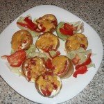 A mélyhűtőből kikapkodok annyi kosárkát, ami elfogy egy evésre (szerintem annyit nem tudok a mélyhűtőben tárolni, amennyit egy evésre ne tudnánk megenni… de ésszel élünk és eszünk, így tényleg annyit készítek, ami nem okoz még egészségügyi határsértést). Jegesen megtöltöm a kosárkákat sóval, borssal és bőségesen fokhagymával (mert ugye az igazi piacos-strandos lángos fokhagymás 🙂 ), elkevert tejföllel. Erre halmozom az összevágott kolbász és/vagy szalámi darabkákat, az egészet befedem bőségesen reszelt sajttal. Előmelegített, 180 fokos sütőben 5 percig sütöm. Ez alatt az idő alatt a yokrhire puding kosárkák felengednek, lángos szerűen a szélükön kissé ropogósak lesznek és a sajt is szépen megpirul a tetején. Felejthetetlen – hazai – ízélmény!